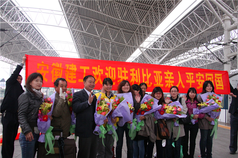 早上7點(diǎn),春寒料峭。省政府、省國(guó)資委、省商務(wù)廳、省外辦等有關(guān)領(lǐng)導(dǎo),安徽建工集團(tuán)董事長(zhǎng)胡運(yùn)成及有關(guān)單位負(fù)責(zé)同志就早早抵達(dá)了火車站等候。7時(shí)40分,隨著從北京駛來的Z73次火車平穩(wěn)停站,等候人員拉起了“熱烈歡迎我省外派利比亞人員第一批親人平安返回家鄉(xiāng)”、“安徽建工歡迎駐利比亞親人平安回國(guó)”等醒目的橫幅,手捧鮮花列隊(duì)歡迎從利比亞回國(guó)的人員。