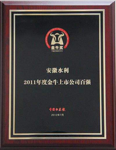 7月7日,中國(guó)證券報(bào)第14屆(2011年度)“上市公司金牛獎(jiǎng)”頒獎(jiǎng)活動(dòng)在天津隆重舉行,安徽水利榮獲“2011年度金牛上市公司百?gòu)?qiáng)”榮譽(yù)稱(chēng)號(hào),并以綜合實(shí)力位列百?gòu)?qiáng)榜第58位,這是安徽水利首次獲得該項(xiàng)殊榮。