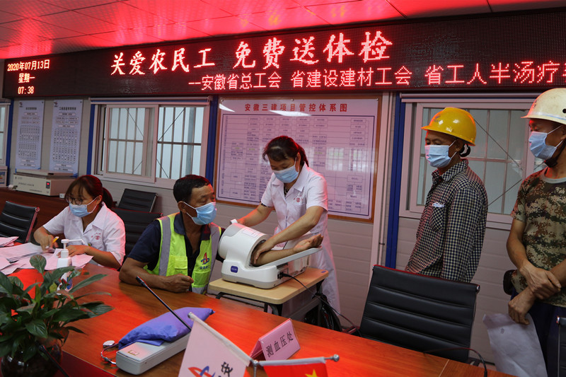 7月13日,由安徽省總工會(huì)組織,省建設(shè)建材工會(huì)、省工人半湯溫泉療養(yǎng)院承辦的“關(guān)愛農(nóng)民工、免費(fèi)送體檢”活動(dòng)來到了安徽三建合肥市中心圖書館項(xiàng)目,近120名現(xiàn)場(chǎng)農(nóng)民工參加了體檢。