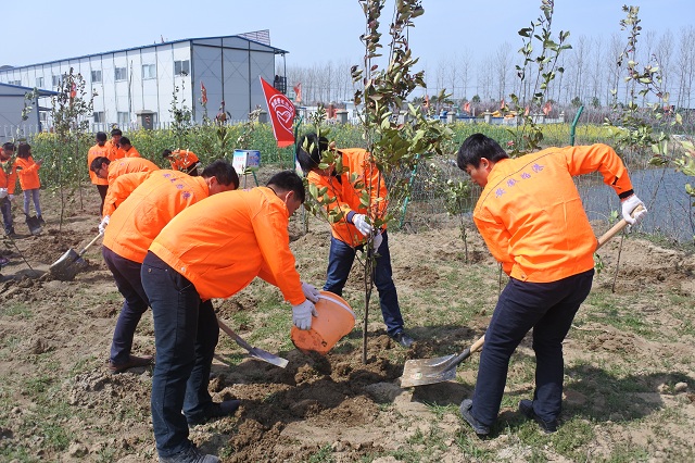 春回大地萬(wàn)物蘇,植樹添綠正當(dāng)時(shí)。為踐行環(huán)保理念,項(xiàng)目部團(tuán)支部于3月21日組織了植樹活動(dòng)。大家統(tǒng)一著裝,佩戴志愿者徽章,高揚(yáng)“建工青年志愿者服務(wù)隊(duì)”隊(duì)旗,在拌和站及項(xiàng)目部附近的空地上種植了近500棵樹苗?;顒?dòng)中,志愿者們積極行動(dòng),干得熱火朝天,大家三五人一組,揮鍬鏟土,扶苗填坑,踏土夯苗,認(rèn)真完成每一道工序??粗恢曛辍扒嗄曛驹笜洹背晒υ苑N,大家都露出了會(huì)心的笑容,項(xiàng)目部也在喜添新綠后變得生機(jī)盎然。