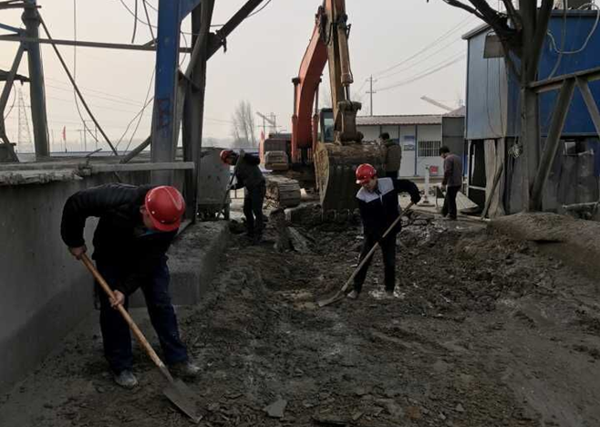 在后場的場站大門、分區(qū)隔離帶、拌合站等處,突擊隊員們有的掃、有的鏟、有的運(yùn)、有的推,個個干勁使足,有條不紊地對各處的塵土、淤泥、結(jié)塊混凝土進(jìn)行清理。
