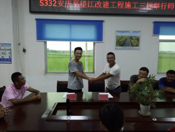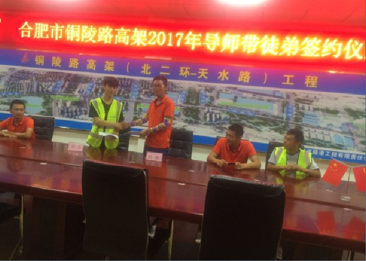 在銅陵路高架項(xiàng)目部,與會(huì)老員工結(jié)合自身崗位職責(zé),一一分享自己的入職經(jīng)歷,給新員工提出了意見(jiàn)建議,要求新員工轉(zhuǎn)變觀(guān)念,盡快適應(yīng)和融入角色,鍛煉自己早日成長(zhǎng)成才,為服務(wù)企業(yè)發(fā)展貢獻(xiàn)力量。團(tuán)支部書(shū)記石海濤闡述了“導(dǎo)師帶徒”活動(dòng)的目的和意義,要求導(dǎo)師通過(guò)“傳、幫、帶”的方式,將技術(shù)知識(shí)、職業(yè)道德作風(fēng)傳授給新員工,切實(shí)有效地加快新學(xué)員理論知識(shí)到實(shí)踐能力的轉(zhuǎn)換進(jìn)度,使新員工盡快更好地適應(yīng)工作崗位,全身心地投入到工作和學(xué)習(xí)中。 3對(duì)師徒經(jīng)過(guò)交流認(rèn)知,雙向選擇后,現(xiàn)場(chǎng)簽字確立師徒關(guān)系。