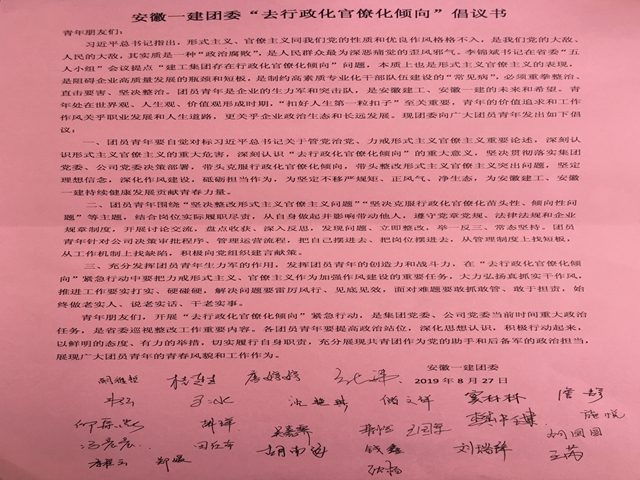 (四)在2019年的“去行政化官僚化傾向”的活動中,團(tuán)委組織青年倡議活動,團(tuán)員青年嚴(yán)格要求自己,不搞形式主義、官僚主義并堅(jiān)決抵制,大力弘揚(yáng)真抓實(shí)干作風(fēng)。同時(shí)各團(tuán)支部組織青年團(tuán)員結(jié)合公司的實(shí)際、自己崗位職責(zé),對公司的制度文件、審批流程、決策程序、管理制度等方面進(jìn)行討論交流并提出相關(guān)的意見建議。