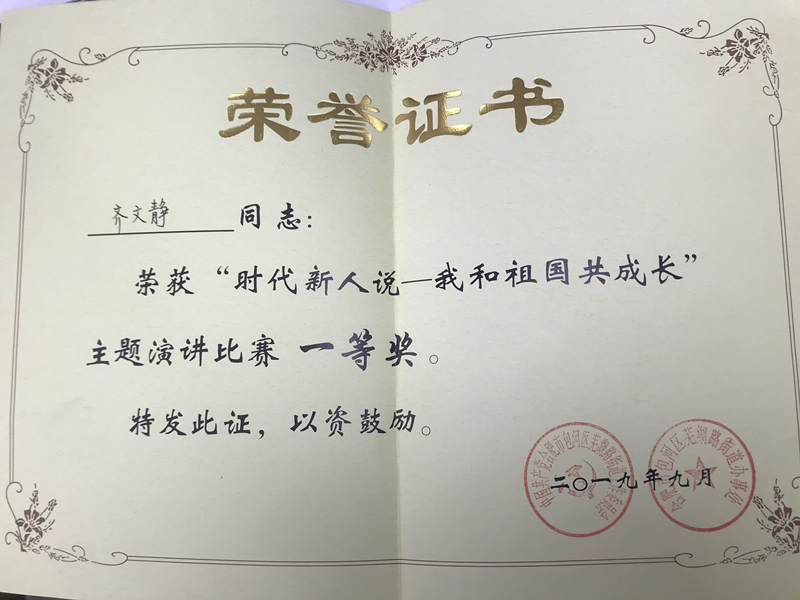 2019包河區(qū)蕪湖路街道“我與祖國共成長”演講比賽第一名