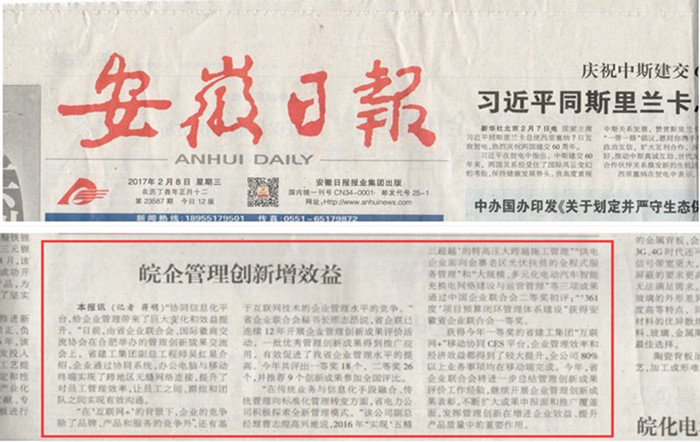 2月8日,《安徽日報》在產(chǎn)經(jīng)新聞版塊中發(fā)表《皖企管理創(chuàng)新增效益》一文,文章高度評價集團CES協(xié)同平臺建設成效。