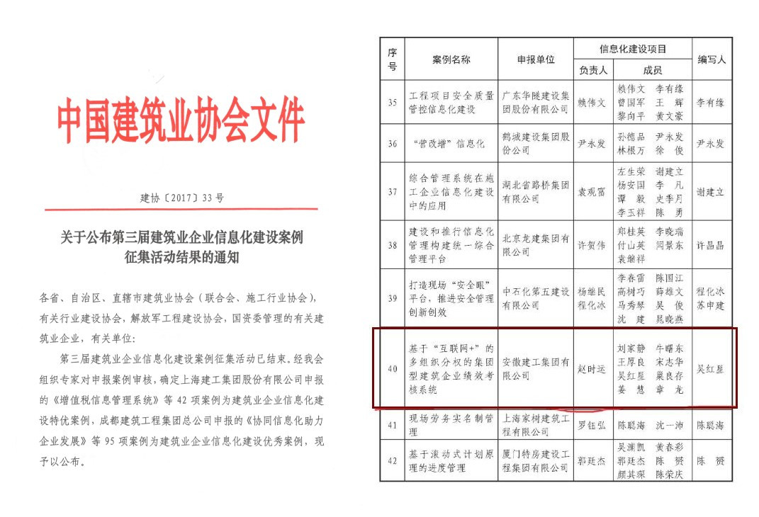 由中國建筑業(yè)協(xié)會組織開展的第三屆建筑業(yè)企業(yè)信息化建設(shè)案例評選活動揭曉,安徽建工集團申報的《基于“互聯(lián)網(wǎng)+”的多組織分權(quán)的集團型建筑企業(yè)績效考核系統(tǒng)》,獲評為第三屆全國建筑業(yè)企業(yè)信息化建設(shè)特優(yōu)案例。截止目前集團已經(jīng)有兩項信息化系統(tǒng)獲得了全國信息化建設(shè)特優(yōu)案列。