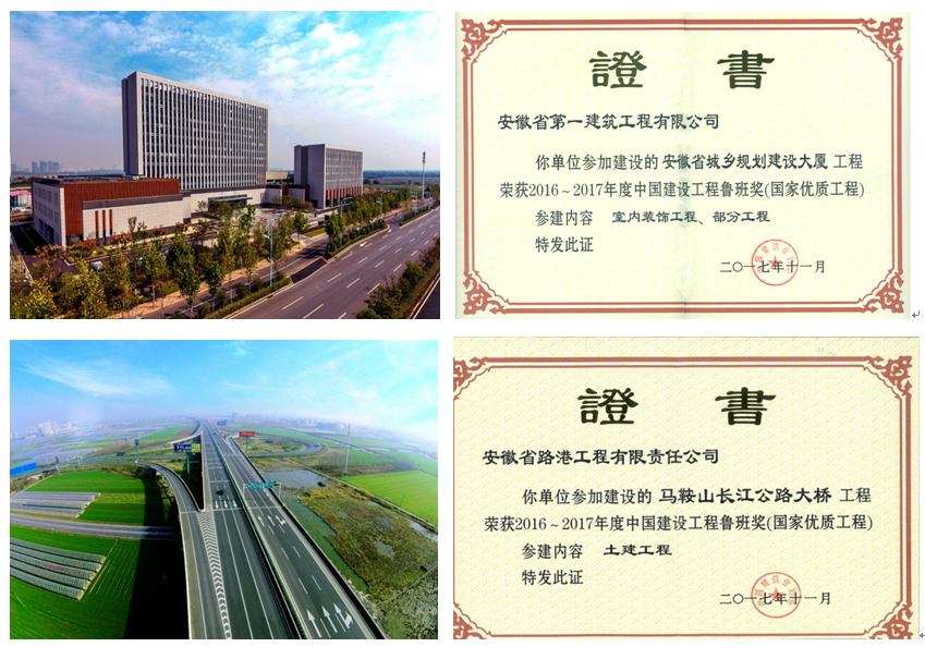 2017年11月6日,中國建筑業(yè)協(xié)會“紀(jì)念魯班獎創(chuàng)立30周年暨2016-2017年度創(chuàng)精品工程經(jīng)驗(yàn)交流會”在北京隆重召開。安徽建工集團(tuán)有限公司承建(安徽省第一建筑工程有限公司參建)的“安徽省城鄉(xiāng)規(guī)劃建設(shè)大廈”和安徽路港工程有限責(zé)任公司參建的“馬鞍山長江公路大橋”兩項(xiàng)工程喜獲2016年-2017年度中國建設(shè)工程“魯班獎(國家優(yōu)質(zhì)工程)”。自1987年“魯班獎”創(chuàng)立以來安徽建工集團(tuán)有限公司共獲15項(xiàng)“魯班獎(國家優(yōu)質(zhì)工程)”,經(jīng)申報(bào)評選在此次表彰會上被授予“創(chuàng)建魯班獎工程優(yōu)秀企業(yè)(承建單位)”榮譽(yù)稱號, 充分體現(xiàn)了國有大型特級施工總承包企業(yè)的榜樣引領(lǐng)和示范帶頭作用,最好地詮釋了“誠信、創(chuàng)新、優(yōu)質(zhì)、共贏”的安徽建工經(jīng)營理念。
