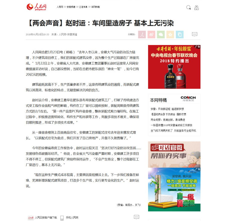1月22日上午,安徽省第十三屆人民代表大會第一次會議在安徽大劇院隆重開幕。省人大代表、省十三屆人大一次會議計劃和預(yù)算審查委員會委員,安徽建工集團(tuán)董事長、黨委書記趙時運(yùn)出席會議。當(dāng)天上午,趙時運(yùn)代表現(xiàn)場就“堅決打好污染防治攻堅戰(zhàn)、推進(jìn)裝配式建筑”接受人民網(wǎng)安徽頻道記者采訪。