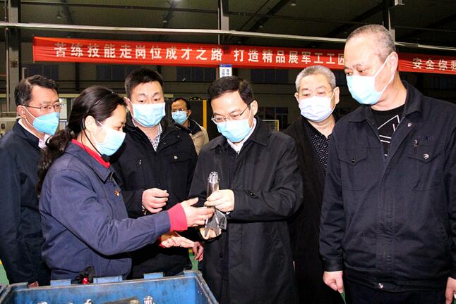 3月4日下午,李中赴軍工集團(tuán)調(diào)研,了解企業(yè)疫情防控、復(fù)工復(fù)產(chǎn)和經(jīng)營發(fā)展情況,對企業(yè)在抓好疫情防控的同時積極組織軍品生產(chǎn)供應(yīng)、努力為國防建設(shè)提供裝備保障給予充分肯定。他指出,軍工集團(tuán)歷經(jīng)艱苦光輝的創(chuàng)業(yè)歷程,為國防現(xiàn)代化建設(shè)作出了積極貢獻(xiàn)。下一步要在抓好疫情防控的同時,突出軍品特色,堅持創(chuàng)新驅(qū)動,加強(qiáng)黨的建設(shè),奮力走出一條軍民融合發(fā)展的新路子。隨后,李中前往軍工集團(tuán)所屬神劍科技股份公司,實地察看生產(chǎn)一線疫情防控和復(fù)工復(fù)產(chǎn)情況。在神劍公司電裝工房,李中詳細(xì)了解軍品科研產(chǎn)品試驗情況,他指出,要下好科技創(chuàng)新“先手棋”,堅持自主創(chuàng)新、協(xié)同創(chuàng)新雙輪驅(qū)動,繼續(xù)做強(qiáng)做優(yōu)做大軍品產(chǎn)業(yè)。在神劍公司加機(jī)分廠,李中與車間技術(shù)帶頭人深入交流,要求集團(tuán)黨委堅持以人才為本,為科技人員創(chuàng)新創(chuàng)造創(chuàng)業(yè)提供更加有力的保障。當(dāng)?shù)弥訖C(jī)分廠在安全防控的前提下,已實現(xiàn)全員兩班輪替生產(chǎn)時,李中十分欣慰,再三叮囑加機(jī)分廠負(fù)責(zé)同志要堅決落實疫情防控和安全生產(chǎn)第一責(zé)任人職責(zé),統(tǒng)籌做好職工“8小時以內(nèi)”和“8小時以外”的管理,確保安全有序?qū)崿F(xiàn)滿產(chǎn)。