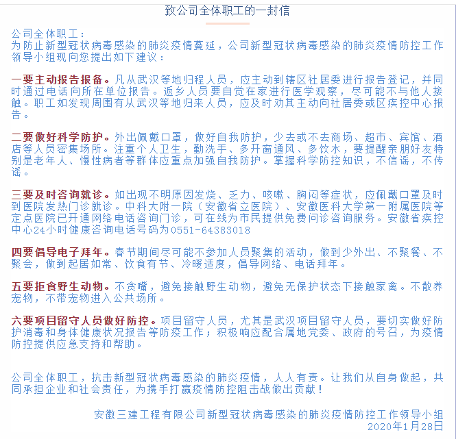 疫情牽動億萬人心。黨中央、國務(wù)院高度重視疫情防治工作,習(xí)近平總書記作出重要指示,強(qiáng)調(diào)要把人民群眾生命安全和身體健康放在第一位,堅決遏制疫情蔓延勢頭。安徽三建公司黨委迅速行動,積極貫徹落實(shí)黨中央、國務(wù)院和省委、省政府、省國資委和集團(tuán)公司關(guān)于新型冠狀病毒肺炎疫情防控工作部署要求,在春節(jié)前重點(diǎn)部署武漢項目人員疫情防控工作的基礎(chǔ)上,1月27日發(fā)出緊急通知,全面落實(shí)公司防控工作。