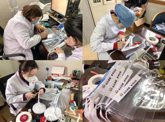 在醫(yī)院部分防護物資短缺的情況下,為了加強醫(yī)護人員的自身防護,降低被感染的概率,青年突擊隊成員們共同努力出謀劃策,利用文件袋、透明塑料薄膜制作成防護面罩,有效地緩解了防護用品短缺的難題。