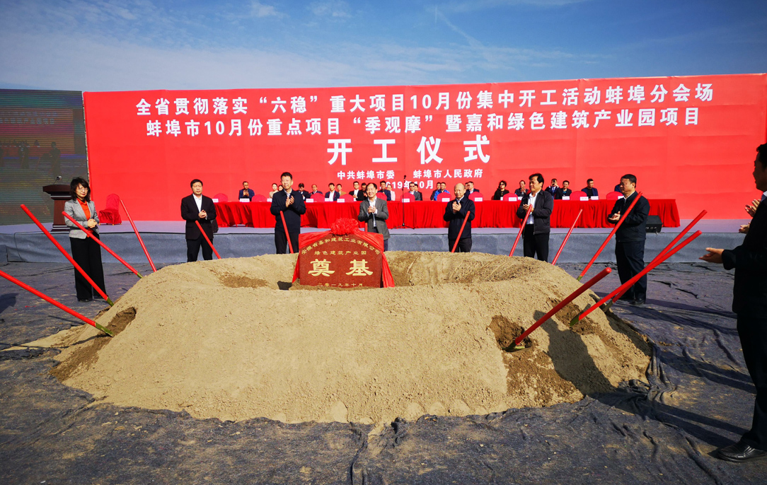 10月28日,安徽水利嘉和建筑工業(yè)產(chǎn)業(yè)園項(xiàng)目現(xiàn)場,彩旗飄揚(yáng),挖掘機(jī)、推土機(jī)整裝待發(fā);綴著橫幅的空飄猶如一串串大紅燈籠高高掛在空中,到處洋溢著喜悅的氛圍。蚌埠市10月份重大項(xiàng)目集中開工暨嘉和綠色建筑產(chǎn)業(yè)園項(xiàng)目開工儀式在此隆重舉行。