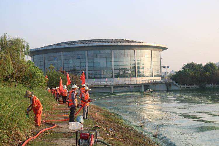 當(dāng)天,一大早,70多名黨員、職工就感到巢湖環(huán)湖北路塘西河大橋邊,現(xiàn)場成立了三支黨員突擊隊,大家頭頂烈日,冒著37攝氏度的高溫,投入到治理藍(lán)藻攻堅戰(zhàn)中。大家沿湖開展集中作業(yè),連續(xù)抽取湖水投放殺藻劑或絮凝劑,再排放回湖中。一整天工作中, 在藍(lán)藻治理活動中,廣大黨員、團(tuán)員勇當(dāng)先鋒,連續(xù)工作12小時。 大家的工作服干了又濕,濕了又干。十二公司青年黨員曾祥軍同志說:“八百里巢湖是合肥的名片,是合肥市寶貴的自然資源,能夠參與到巢湖藍(lán)藻治理中,做保衛(wèi)環(huán)境的戰(zhàn)士,義不容辭”。