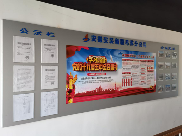 走進安徽安裝公司新疆烏蘇分公司辦公區(qū),一塊紅色的黨建公開欄首先映入眼簾。公開欄還包括黨員風采、公示欄、黨務公開、光榮榜等板塊,成為分公司一處醒目的景觀。