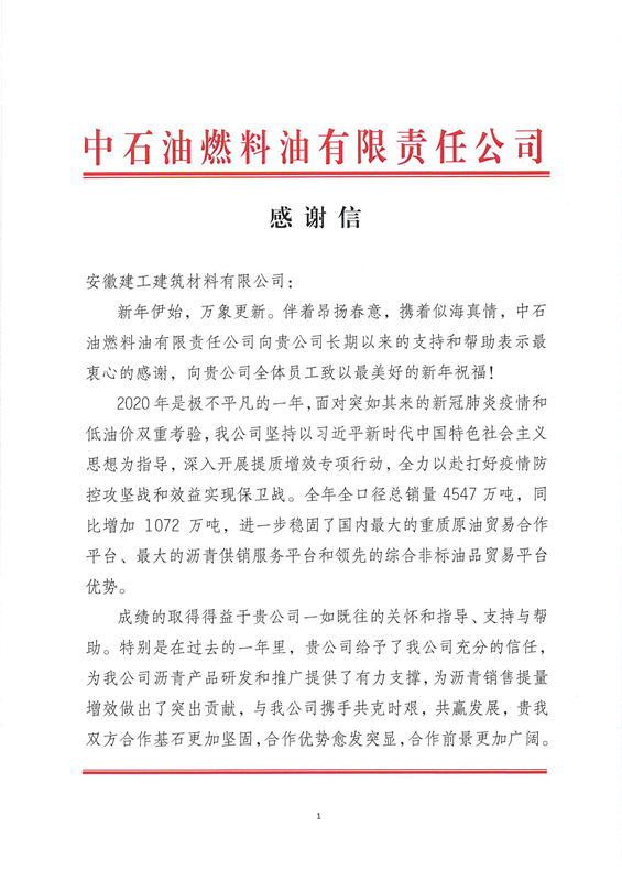 1月26日,中石油燃料油有限責(zé)任公司華東銷售分公司一行到訪安建建材,送來(lái)中石油燃料油公司北京總部寫(xiě)給安建建材的感謝信。感謝信中說(shuō)道:雙方合作以來(lái),特別是在過(guò)去的一年里,安建建材為中石油燃料油公司瀝青產(chǎn)品研發(fā)和推廣提供了有力支撐,為中石油燃料油公司瀝青銷售提量增效做出了突出貢獻(xiàn),與中石油燃料油公司攜手共克時(shí)艱,共贏發(fā)展,雙方合作基石更加堅(jiān)固,合作優(yōu)勢(shì)愈發(fā)突顯,合作前景更加廣闊。