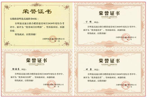 業(yè)主的好評是對我們最大的認可:明巢路基02標(biāo)在明巢高速公路合肥段項目公司2020年度項目綜合考評比分中排名第一,榮獲“優(yōu)秀項目經(jīng)理部”榮譽稱號,項目部5人榮獲2020年度“優(yōu)秀建設(shè)者”榮譽稱號。