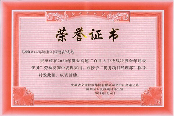 滁天高速02標(biāo)、滁天高速預(yù)制標(biāo)項目部榮獲安徽交控集團百日大干勞動競賽“優(yōu)秀項目經(jīng)理部”稱號。