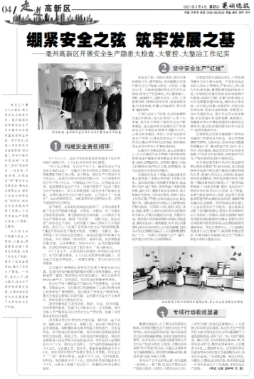 年后復工不久,亳州市高新區(qū)即對轄區(qū)內(nèi)的施工單位進行逐個復工復產(chǎn)以及安全生產(chǎn)隱患大檢查、大管控、大整治。3月3日上午,亳州市高新區(qū)建管主任、第五管理中心主任、環(huán)保中心主任等領(lǐng)導以及亳州市記者來到亳州濱江壹號項目進行實地現(xiàn)場檢查,并采訪了項目經(jīng)理朱曉亮。在聽取項目匯報、查閱安全管控資料后,當?shù)馗髦鞴懿块T領(lǐng)導充分肯定了項目在現(xiàn)場安全、環(huán)保管控等方面的有力舉措,并在亳州晚報上刊登了項目全方位的安全管理體系。