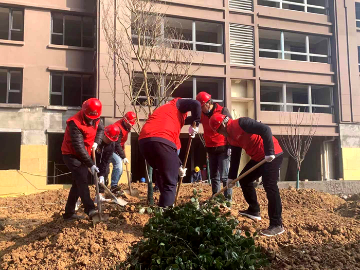 沛縣支部聯(lián)合安徽一建組織開展植樹活動。3月12日,團員青年前往安建地產(chǎn)·漢城源筑書香苑園林景觀處,分工協(xié)作——搬運樹苗、挖坑放樹苗、填土踏實,最后澆水灌溉,小心仔細地為春天增上一抹生機。在大家共同辛勤勞動下,書香苑園林景觀處裸露的黃土上多了一顆顆小樹苗,為明媚的春光又增添了一份綠意,更顯生機勃勃。此次活動中全體參與人員親手栽種樹苗,增強了愛樹護樹的意識,強化保護環(huán)境、愛護家園的環(huán)保觀念。