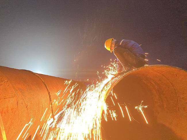 為了保證后期主塔和上橫梁施工的順利往前推進(jìn),在管樁加工安裝之前,項(xiàng)目部對(duì)現(xiàn)場(chǎng)的施工技術(shù)人員進(jìn)行了詳細(xì)的技術(shù)交流和交底。項(xiàng)目部全體員工發(fā)揚(yáng)連續(xù)作戰(zhàn)精神,全力奮戰(zhàn)在施工一線,鼓足干勁,搶抓工期。施工現(xiàn)場(chǎng),白天機(jī)械轟鳴,夜晚挑燈夜戰(zhàn),參建人員放棄休息,不畏艱難,爭(zhēng)分奪秒,以流水作業(yè)的方式進(jìn)行鋼管樁的連接、拼裝和連接系的加工、安裝等工作。同時(shí),項(xiàng)目部備足了物資、機(jī)具、材料以及充足的防暑食品及藥物,安排專人負(fù)責(zé)協(xié)調(diào),保障職工的身體健康,為現(xiàn)場(chǎng)施工保駕護(hù)航。