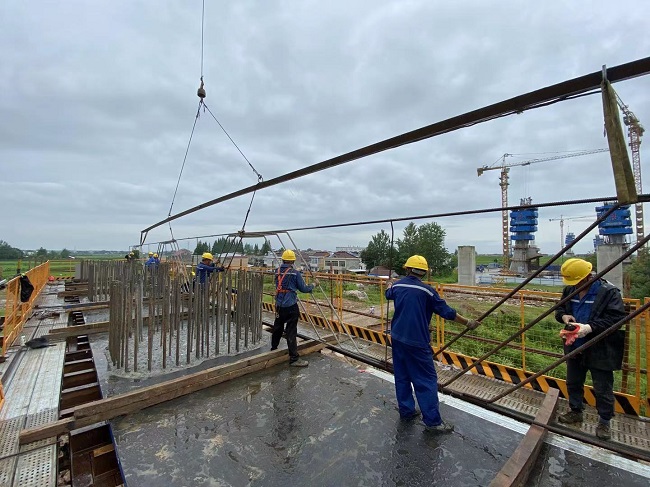 在開工前,項(xiàng)目部精心組織,合理安排。相關(guān)技術(shù)人員進(jìn)行了支撐平臺(tái)的的專項(xiàng)驗(yàn)收,科學(xué)布控施工組織,在原材、配合比、運(yùn)輸、布料方法、澆筑速度等環(huán)節(jié)嚴(yán)格把控,安排專人全程監(jiān)測(cè)支撐平臺(tái)。由于受場(chǎng)地地基基礎(chǔ)限制,施工難度較大,項(xiàng)目部技術(shù)人員克服困難、潛心鉆研,反復(fù)驗(yàn)算推演,采用穿心棒法進(jìn)行施工。在澆筑過(guò)程中,工人協(xié)作緊密,有條不紊地進(jìn)行蓋梁澆筑作業(yè),技術(shù)人員密切關(guān)注澆筑過(guò)程中的每個(gè)細(xì)節(jié),認(rèn)真指導(dǎo),及時(shí)優(yōu)化調(diào)整施工中出現(xiàn)的問(wèn)題。