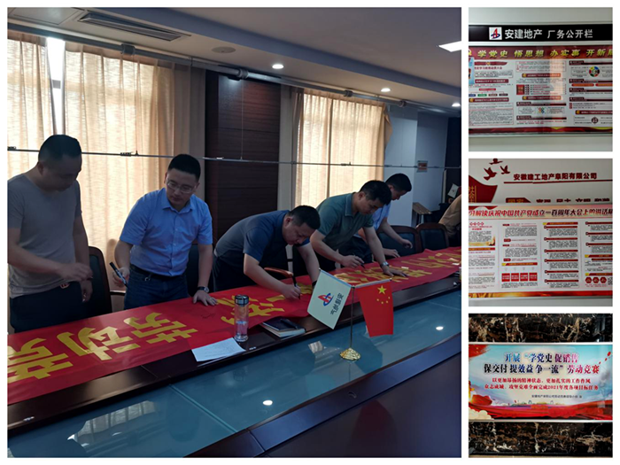 為了激發(fā)職工主人翁精神,營造出人人參與的良好氛圍,阜陽公司召開會(huì)議對勞動(dòng)競賽進(jìn)行再動(dòng)員再部署,并舉辦鄭重的簽名儀式。同時(shí),在銷售案場、辦公區(qū),制作宣傳展板3個(gè),主要宣傳習(xí)近平總書記在建黨100周年大會(huì)上的講話、勞動(dòng)競賽主題、黨史學(xué)習(xí)教育的要求等。