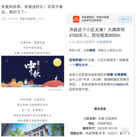 因沛縣防疫要求,安建·漢城源筑項目在中秋節(jié)到來之際,以線上推廣促銷活動為主,舉行了“安家購房季——購好房 送豪禮”活動。邀請抖音網(wǎng)紅前來現(xiàn)場拍攝視頻并在抖音發(fā)布,宣傳活動信息,并通過便民網(wǎng)、微信公眾號、朋友圈等推廣活動及在售信息。營銷策劃部工作人員節(jié)日期間采用輪流排班,堅守營銷崗位,緊抓雙節(jié)期間置業(yè)節(jié)點(diǎn),緊鑼密鼓加速項目銷售工作。安建漢城源筑9月累計認(rèn)購住宅19套,車位22個,累計認(rèn)購金額超2000萬元。
