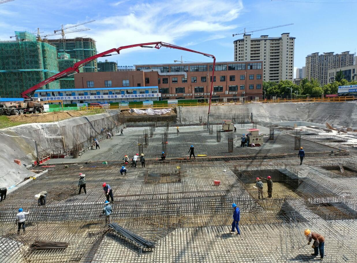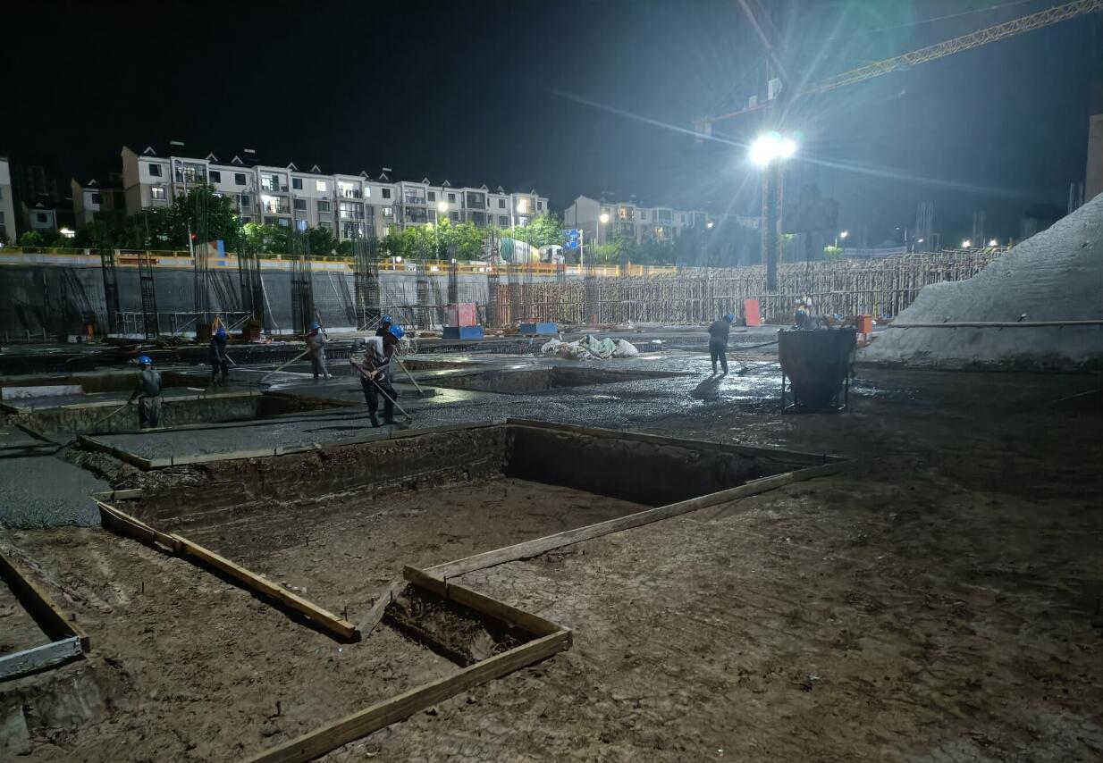 9月23日,人防區(qū)C區(qū)伐板基礎中午12:00開始澆筑。為確?;炷翝仓|量,項目部選定2條快速運輸路線和1條備用路線,調用20臺混凝土罐車不間斷運輸。項目職工自發(fā)全部堅守崗位,晝夜鏖戰(zhàn),全天候對現(xiàn)場混凝土和易性、澆筑、振搗等進行監(jiān)控。項目班子全員靠前指揮,過程中妥善協(xié)調解決工程施工擾民問題。經(jīng)過長達13個小時的奮戰(zhàn),于第二日凌晨1:00最終完成筏板基礎現(xiàn)場混凝土的連續(xù)澆筑,比原計劃提前了近3小時完成。