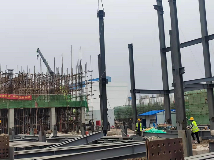 發(fā)酵車間C區(qū)鋼結(jié)構(gòu)區(qū)域,吊裝作業(yè)正在如火如荼進(jìn)行;B區(qū)滿堂腳手架緊張搭設(shè),鋼筋工頂著烈日進(jìn)行鋼筋綁扎,投料車間兩臺挖機(jī)聯(lián)動,進(jìn)行管廊支架基礎(chǔ)基坑開挖,控制車間正在忙忙碌碌進(jìn)行內(nèi)墻二次結(jié)構(gòu)砌筑。各個車間有條不紊的忙碌著,整個項(xiàng)目現(xiàn)場一片火熱,迅速掀起“比、學(xué)、趕、幫、超”施工高潮!