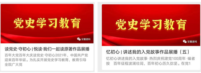 堅(jiān)持“平臺(tái)創(chuàng)新”學(xué)。黨史學(xué)習(xí)教育要更“鮮活”,內(nèi)容形式首先要更“新穎”。為擴(kuò)大黨史學(xué)習(xí)教育受眾面,安徽建科黨委深入探索黨史學(xué)習(xí)教育新模式,策劃開(kāi)展“悅讀·我們一起讀原著”黨史專欄音頻征集活動(dòng)和“憶初心·講述我的入黨故事”主題短文活動(dòng),通過(guò)“全員參與、讀講并舉、共享悅讀”的方式,近百名黨員主動(dòng)領(lǐng)學(xué)領(lǐng)讀,帶頭分享入黨故事,重溫入黨誓詞……一段段經(jīng)典原著、一個(gè)個(gè)先進(jìn)事跡、一則則暖心故事通過(guò)微信平臺(tái)“聲”入基層、深入人心,黨史學(xué)習(xí)教育不斷縱深推進(jìn)。累計(jì)展播黨史音頻作品28段、入黨初心故事46篇,閱讀量3000余次,得到了較好反響。堅(jiān)持正確輿論導(dǎo)向,強(qiáng)化宣傳引導(dǎo),集中刊登建黨百年宣傳標(biāo)識(shí)和標(biāo)語(yǔ),開(kāi)設(shè)獻(xiàn)禮建黨百年系列報(bào)道專欄,精心拍攝《五一專欄|致敬每一位辛勤的勞動(dòng)者》《不忘初心》主題微視頻,為黨史學(xué)習(xí)教育營(yíng)造良好輿論氛圍。