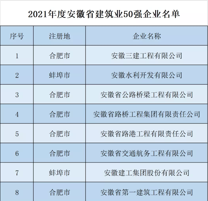 2月10日,省住房城鄉(xiāng)建設(shè)廳公布2021年度安徽省建筑業(yè)10強縣(市)、10強區(qū)、50強企業(yè)名單,建工控股共有8家單位入選2021年度安徽省建筑業(yè)50強企業(yè)。