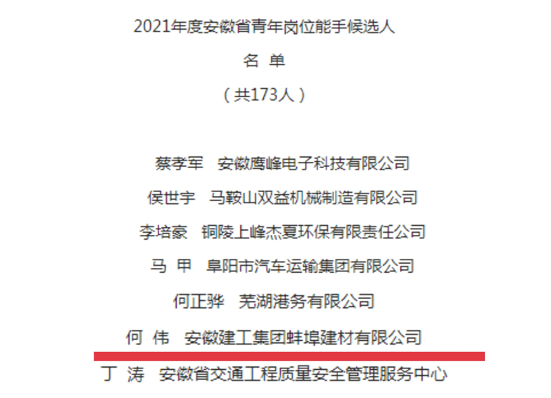 近日,共青團安徽省委傳來喜訊,安徽建工建材科技集團有限公司職工何偉被授予“2021年度安徽省青年崗位能手”榮譽稱號。