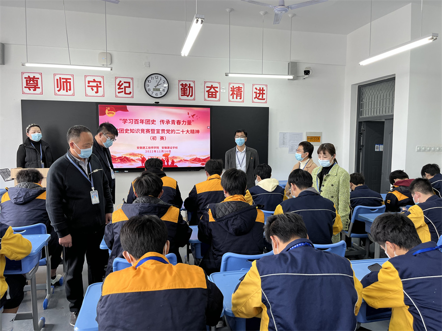 為深入宣傳貫徹黨的二十大精神,慶祝中國共青團成立一百周年,學習習近平新時代中國特色社會主義思想及關于青年工作的重要思想,推動廣大學生對黨團史知識的進一步學習,真正達到以賽促學,以學促用目的,安徽建工技師學院團委舉辦了“學習百年團史,傳承青春力量”黨團史知識競賽暨宣貫黨的二十大精神活動。學院黨委委員、副院長任建設親臨競賽現場指導,院長助理曹新彩、德育工作部主任楊繼強、紀委副書記王海及相關部門負責人觀摩了競賽。