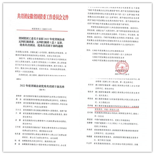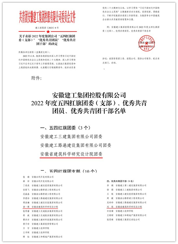 近日,省國資委團(tuán)工委、建工集團(tuán)團(tuán)委相繼公布了2022年度省屬企業(yè)和安徽建工集團(tuán)控股有限公司五四紅旗團(tuán)委(團(tuán)支部)、五四紅旗團(tuán)(總)支部、優(yōu)秀共青團(tuán)員、優(yōu)秀共青團(tuán)干部名單,安徽省建科院1個(gè)集體、3名個(gè)人受表彰。