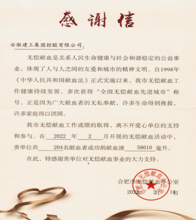 2月10日獻(xiàn)血倡議發(fā)起,集團(tuán)各級工會(huì)組織積極響應(yīng),廣泛宣傳,短短一天就有近300名職工踴躍報(bào)名參加。獻(xiàn)血當(dāng)天分別設(shè)立了安建國際大廈獻(xiàn)血點(diǎn)和安徽三建獻(xiàn)血點(diǎn),共計(jì)204名職工成功獻(xiàn)血共計(jì)58010毫升,助力了合肥市血站確保北京冬奧會(huì)血液調(diào)配保障任務(wù)的完成,彰顯了建工職工無私奉獻(xiàn)、積極向上、勇?lián)鐣?huì)責(zé)任的良好品格。