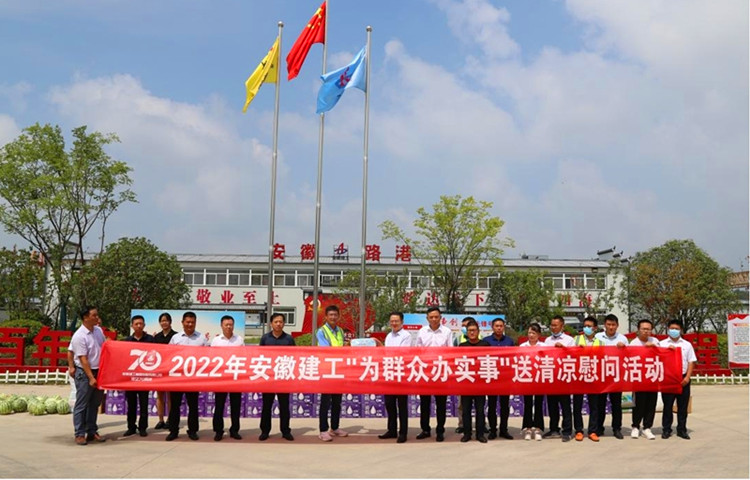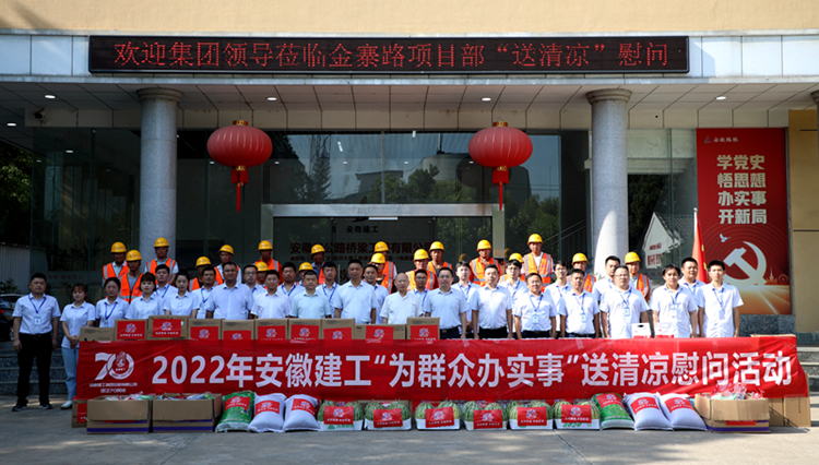 在安徽路橋金寨路項(xiàng)目,集團(tuán)黨委書記、董事長(zhǎng)趙時(shí)運(yùn)將慰問品送到一線職工手中,并和大家親切交談,細(xì)致了解大家的生活工作情況,叮囑要注意勞逸結(jié)合,做好防暑降溫工作。慰問中,他要求,要深入貫徹落實(shí)習(xí)近平總書記關(guān)于安全生產(chǎn)的重要指示精神,嚴(yán)格落實(shí)高溫天氣作業(yè)時(shí)間要求,進(jìn)一步壓實(shí)“五落實(shí)五到位”安全生產(chǎn)主體責(zé)任,加強(qiáng)對(duì)防暑降溫等工作的組織領(lǐng)導(dǎo)、措施落實(shí),以安全高效工作成果迎接黨的二十大和建企70周年。