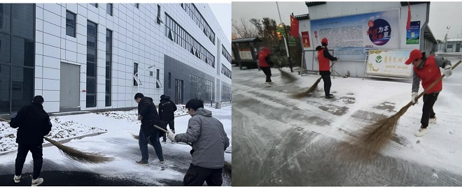第四工程公司組織青年團(tuán)員清掃項(xiàng)目部、道路兩旁積雪。