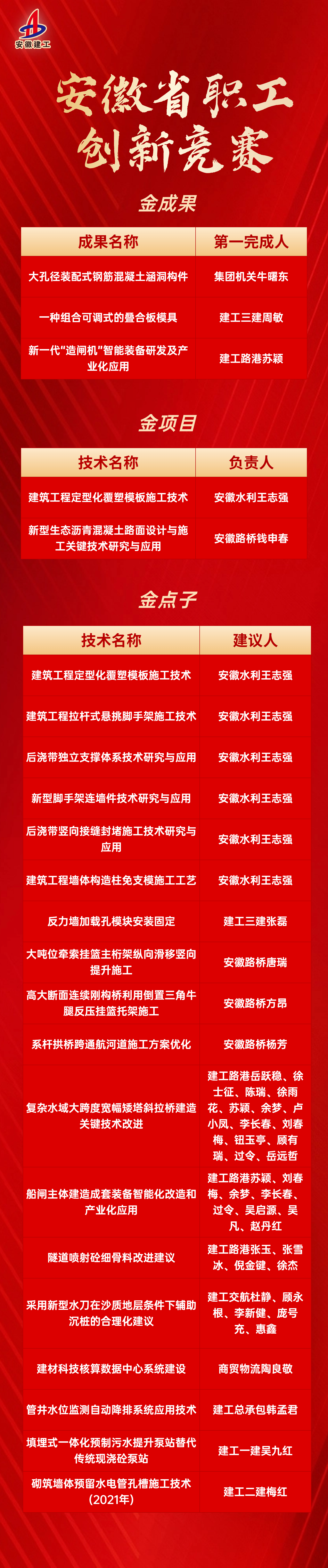 近日,從安徽省總工會傳來好消息,安徽建工集團3項“金成果”、2項“金項目”、20項“金點子”喜獲省職工技術(shù)創(chuàng)新競賽獎。