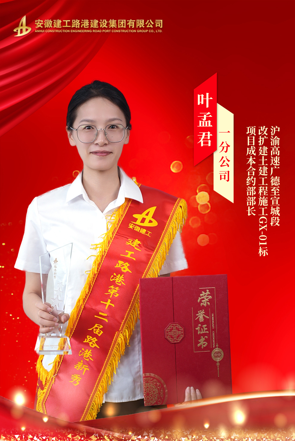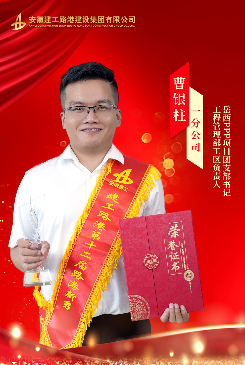 他專業(yè)過硬、愛敬業(yè),從測量員、技術(shù)員一步一個腳印,逐步成長為一名優(yōu)秀的工程管理部部長、物資設(shè)備部部長。2023年,他在合肥市測量競賽中榮獲團體三等獎,同年,被評為市政分公司“先進(jìn)個人”。