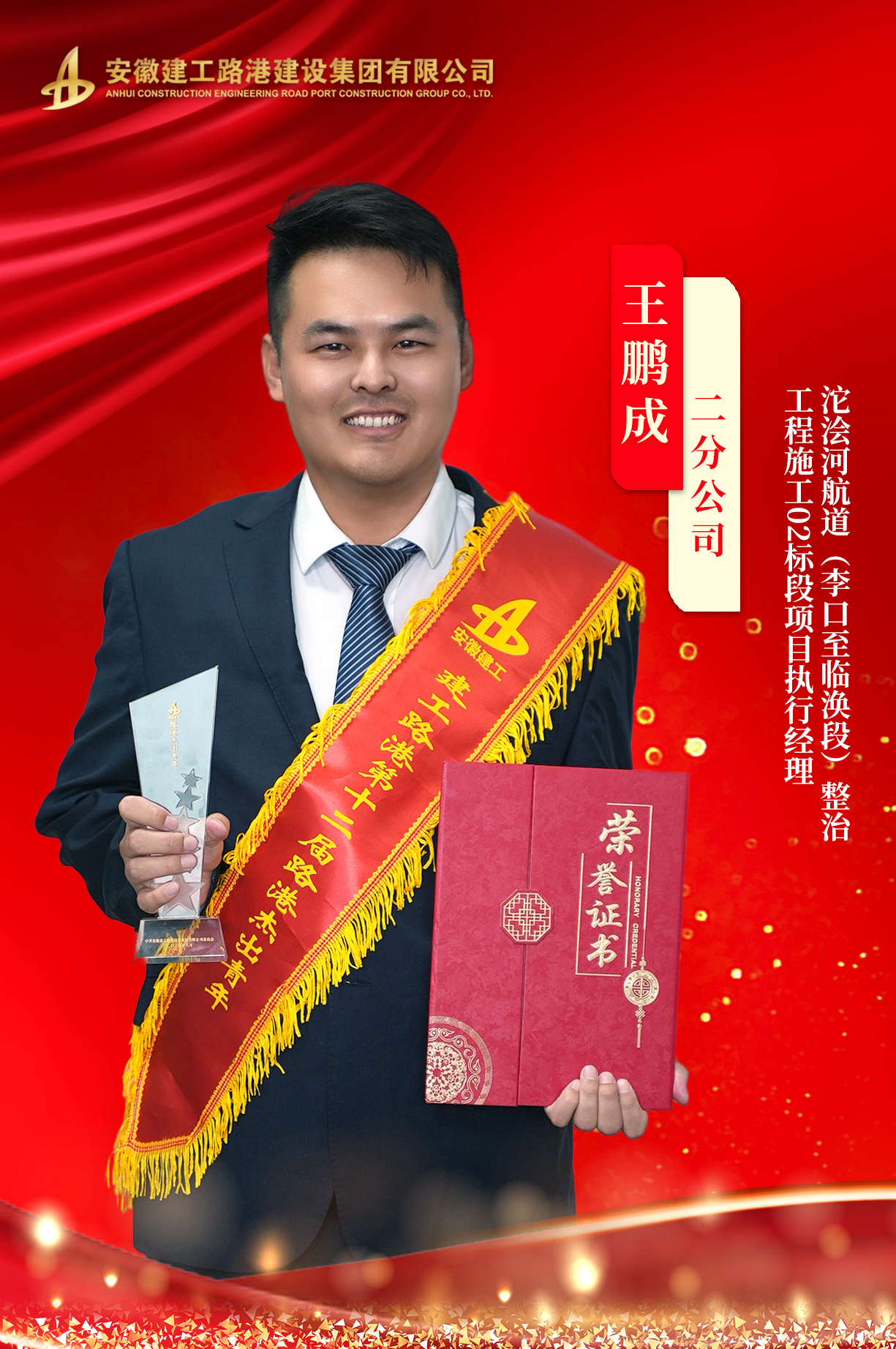 王鵬成,男,漢族,黨員,本科學歷,工程師,一級建造師,現(xiàn)任建工路港二分公司沱澮河航道(李口至臨渙段)整治工程施工02標段項目負責人。