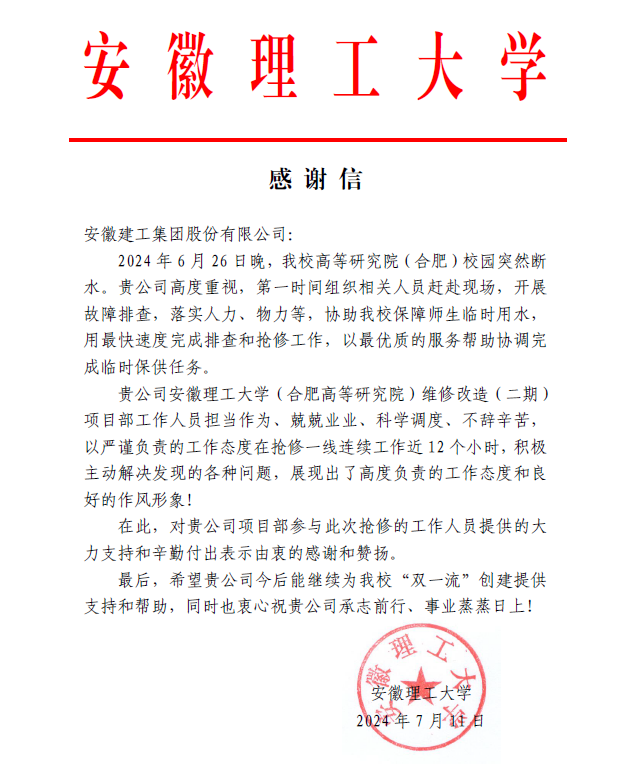 近日,安徽建科總承包分院收到安徽理工大學(xué)感謝信,對(duì)安徽理工大學(xué)(合肥高等研究院)維修改造(二期)項(xiàng)目部在校園夜間突發(fā)斷水搶修過程中提供的大力支持和辛勤付出表示感謝。