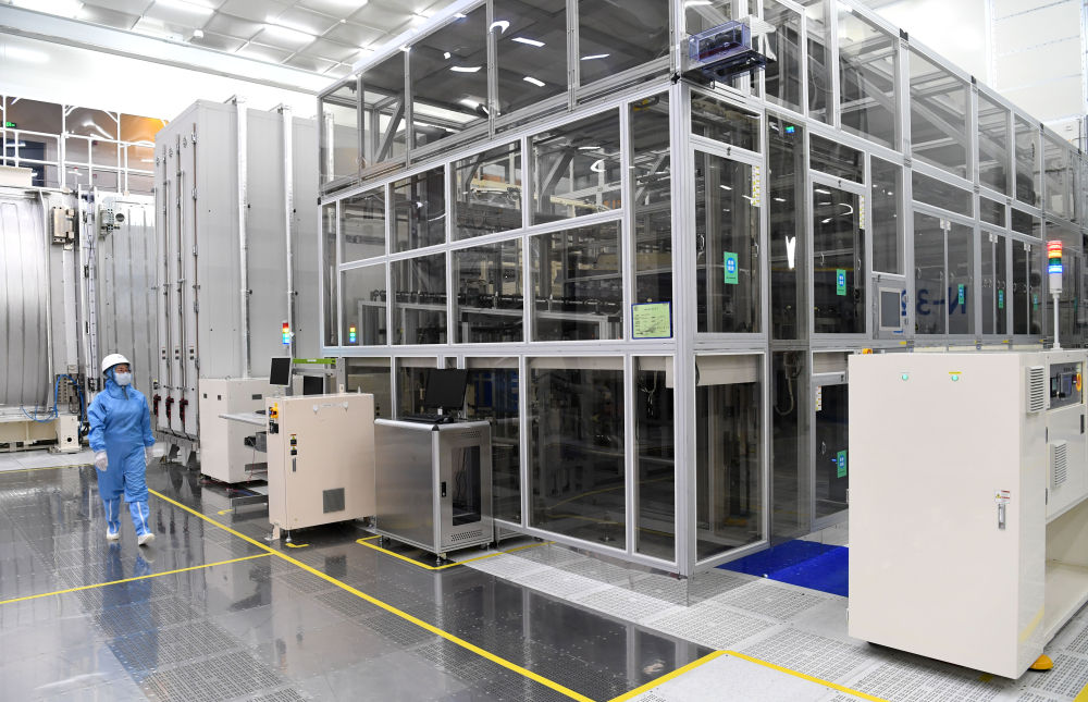 ??2022年7月28日,安徽合肥京東方顯示技術(shù)有限公司的工作人員在10.5代生產(chǎn)線上作業(yè)。