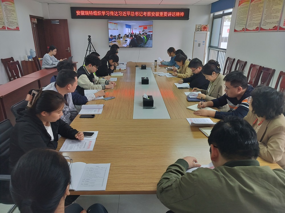 安徽瑞特組織傳達學(xué)習(xí)習(xí)近平總書記考察安徽重要講話精神,全體黨員、各部門負責(zé)人及青年骨干參加。會議強調(diào),全體員工要深入學(xué)習(xí)領(lǐng)會講話精神要義,把學(xué)習(xí)宣傳貫徹習(xí)近平總書記考察安徽重要講話精神作為當(dāng)前和今后一個時期的首要政治任務(wù)。一是認真開展學(xué)習(xí)研討,做到學(xué)深悟透、知行合一;二是抓好宣傳宣講,營造濃厚氛圍;三是結(jié)合公司實際,推動貫徹落實。