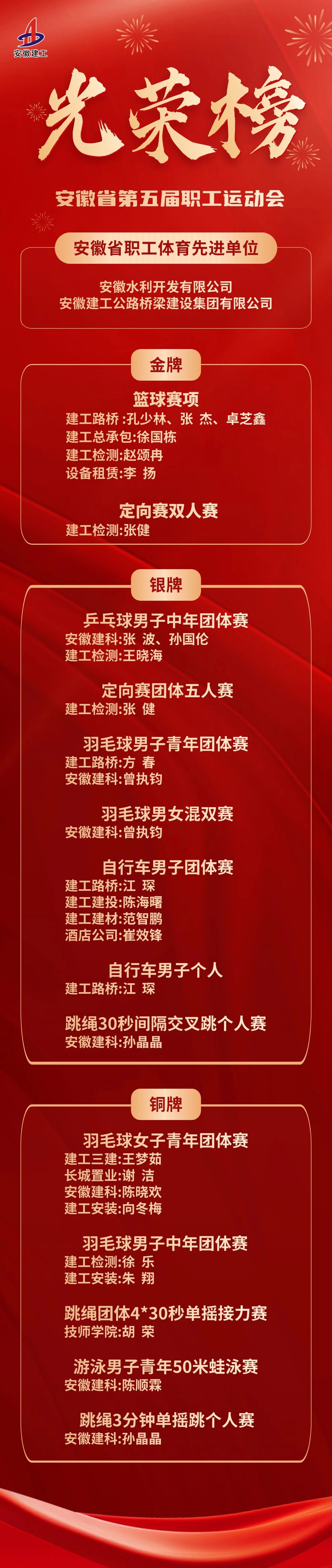 在剛剛閉幕的安徽省第五屆職工運動會上,安徽建工選派81名選手參加了籃球、工間操、中國象棋、定向賽等12項體育賽事,并承辦全省住建系統(tǒng)3個賽項的參賽組織工作。在激烈的角逐中,建工健兒奮勇爭先、捷報頻傳,74名選手榜上有名,斬獲2金7銀5銅良好佳績,安徽水利、建工路橋獲評安徽省職工體育先進單位,綜合成績處于全省第一方陣。