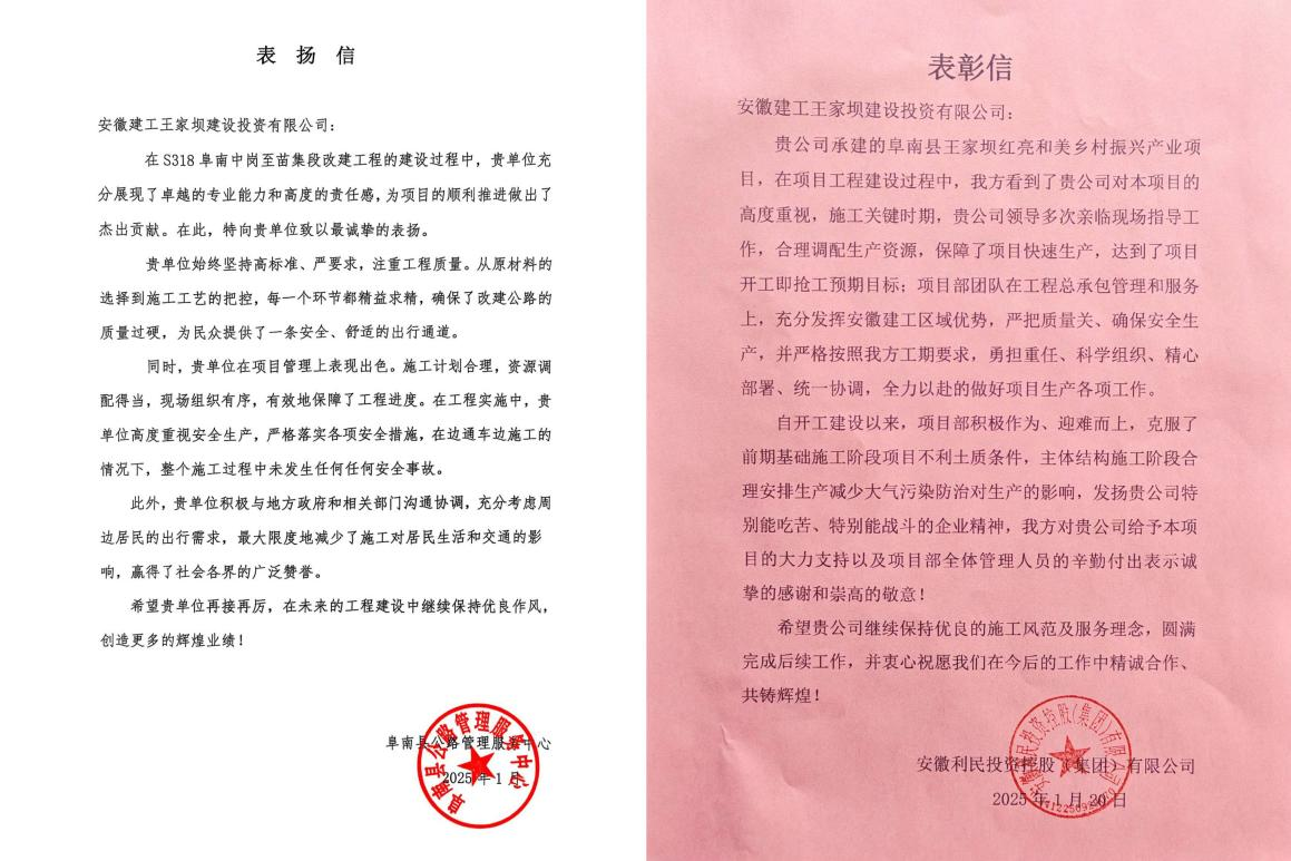 信中指出,安徽建工王家壩建投在項(xiàng)目建設(shè)過程中,全面落實(shí)阜南縣委、縣政府工作要求,扎實(shí)推進(jìn)重點(diǎn)項(xiàng)目建設(shè),取得積極成效。為全縣推進(jìn)高質(zhì)量發(fā)展做出積極貢獻(xiàn),為阜南縣重點(diǎn)項(xiàng)目建設(shè)再立新功。