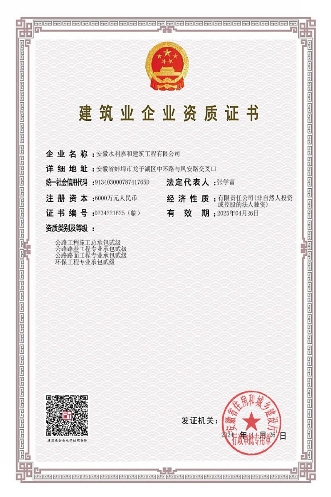 經(jīng)建筑主管部門核準(zhǔn),嘉和建筑成功獲批公路工程施工總承包貳級、公路路基工程專業(yè)承包貳級、公路路面工程專業(yè)承包貳級、環(huán)保工程專業(yè)承包貳級資質(zhì)。