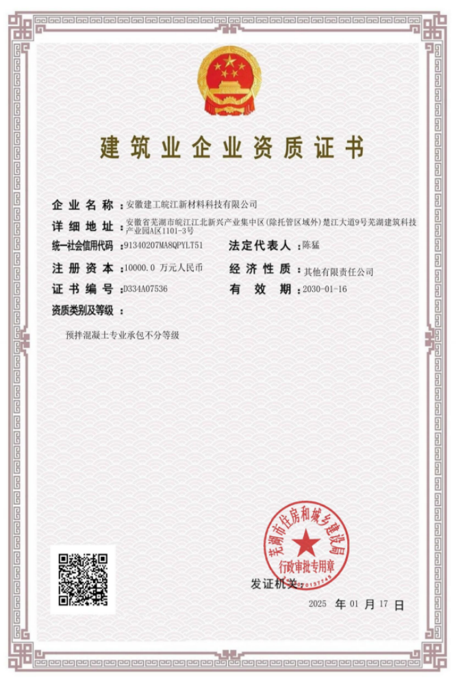 安徽建工皖江新材料科技有限公司經(jīng)蕪湖市住房和城鄉(xiāng)建設(shè)局正式批準(zhǔn),獲得預(yù)拌混凝土專業(yè)承包資質(zhì),此次資質(zhì)的取得,不僅代表皖江新材料從建設(shè)期到運(yùn)營期的轉(zhuǎn)型邁出了重要一步,更為公司在蕪湖預(yù)拌混凝土市場的深入開拓提供了新機(jī)遇。