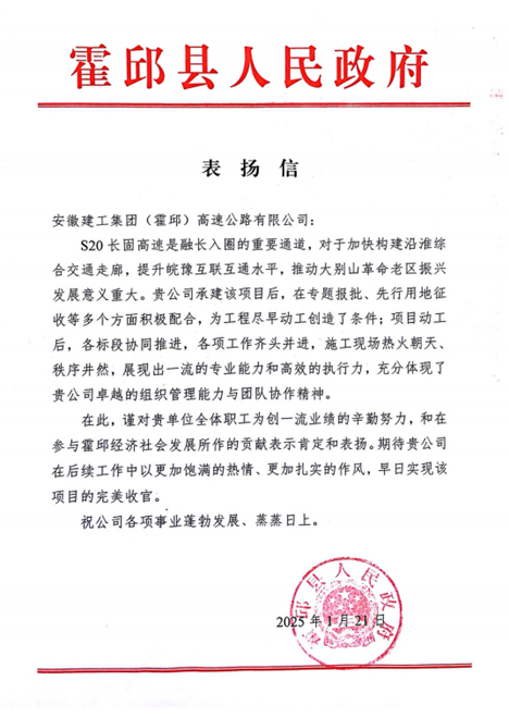 1月24日,建工投資S20長(zhǎng)固高速霍邱至皖豫界段項(xiàng)目喜獲霍邱縣人民政府通報(bào)表?yè)P(yáng),充分肯定了項(xiàng)目公司在前期工作推進(jìn)方面取得的豐碩成果。
