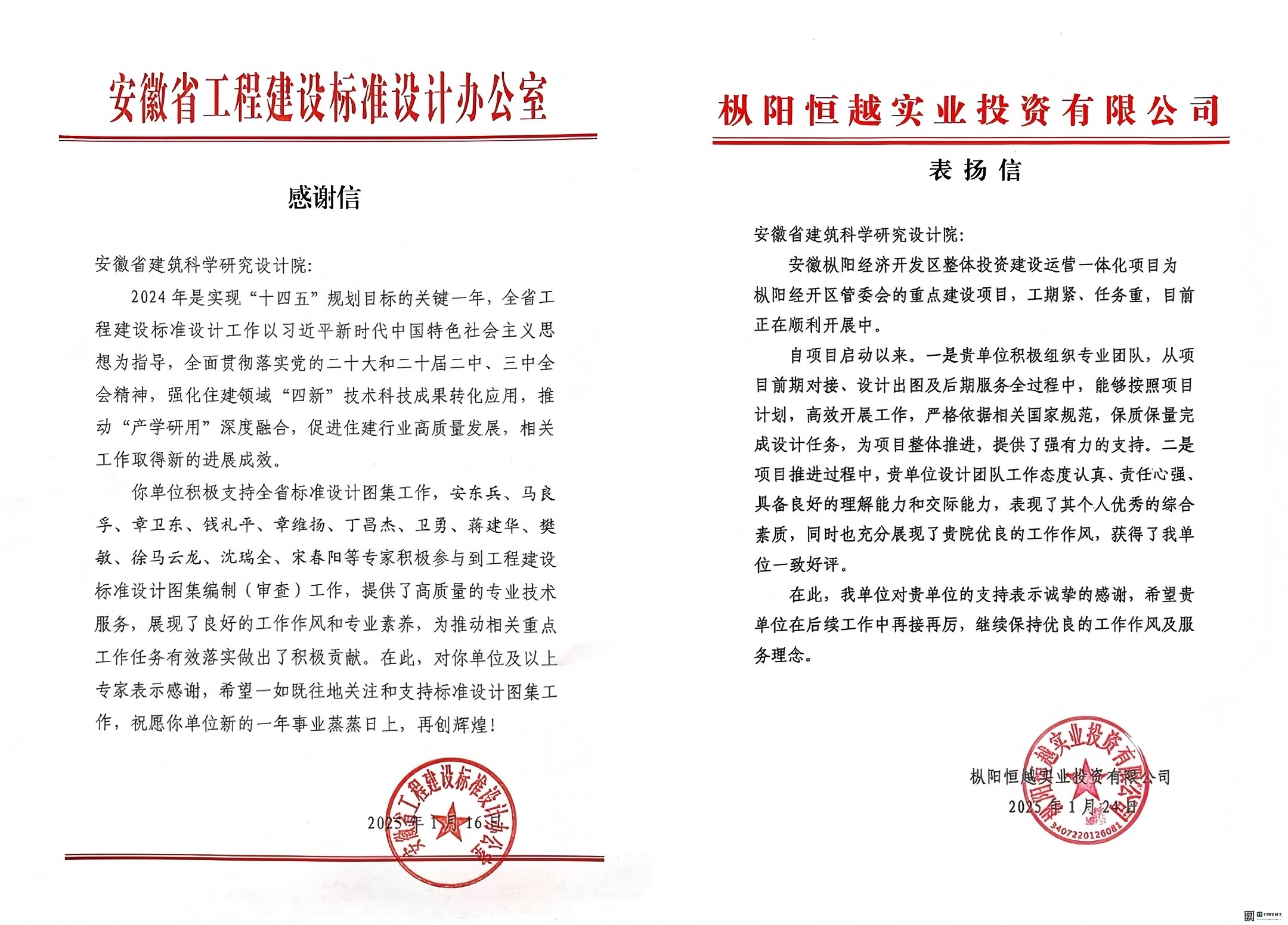 近日,在安徽省工程建設(shè)標(biāo)準(zhǔn)設(shè)計(jì)辦公室的感謝信中,對(duì)安徽建科安東兵、馬良浮、章衛(wèi)東、錢禮平、章維揚(yáng)、丁昌杰、衛(wèi)勇、蔣建華、樊敏、徐馬云龍、沈瑞全、宋春陽(yáng)等專家在工程建設(shè)標(biāo)準(zhǔn)設(shè)計(jì)圖集編制(審查)工作中展現(xiàn)出的高質(zhì)量專業(yè)技術(shù)服務(wù),良好工作作風(fēng)和專業(yè)素養(yǎng)等給予充分肯定和高度贊揚(yáng)。在樅陽(yáng)恒越實(shí)業(yè)投資有限公司發(fā)來的表?yè)P(yáng)信中,對(duì)安徽建科在安徽樅陽(yáng)經(jīng)濟(jì)開發(fā)區(qū)整體投資建設(shè)運(yùn)營(yíng)一體化項(xiàng)目中高效開展工作、保質(zhì)保量完成設(shè)計(jì)任務(wù)等表示誠(chéng)摯的感謝。