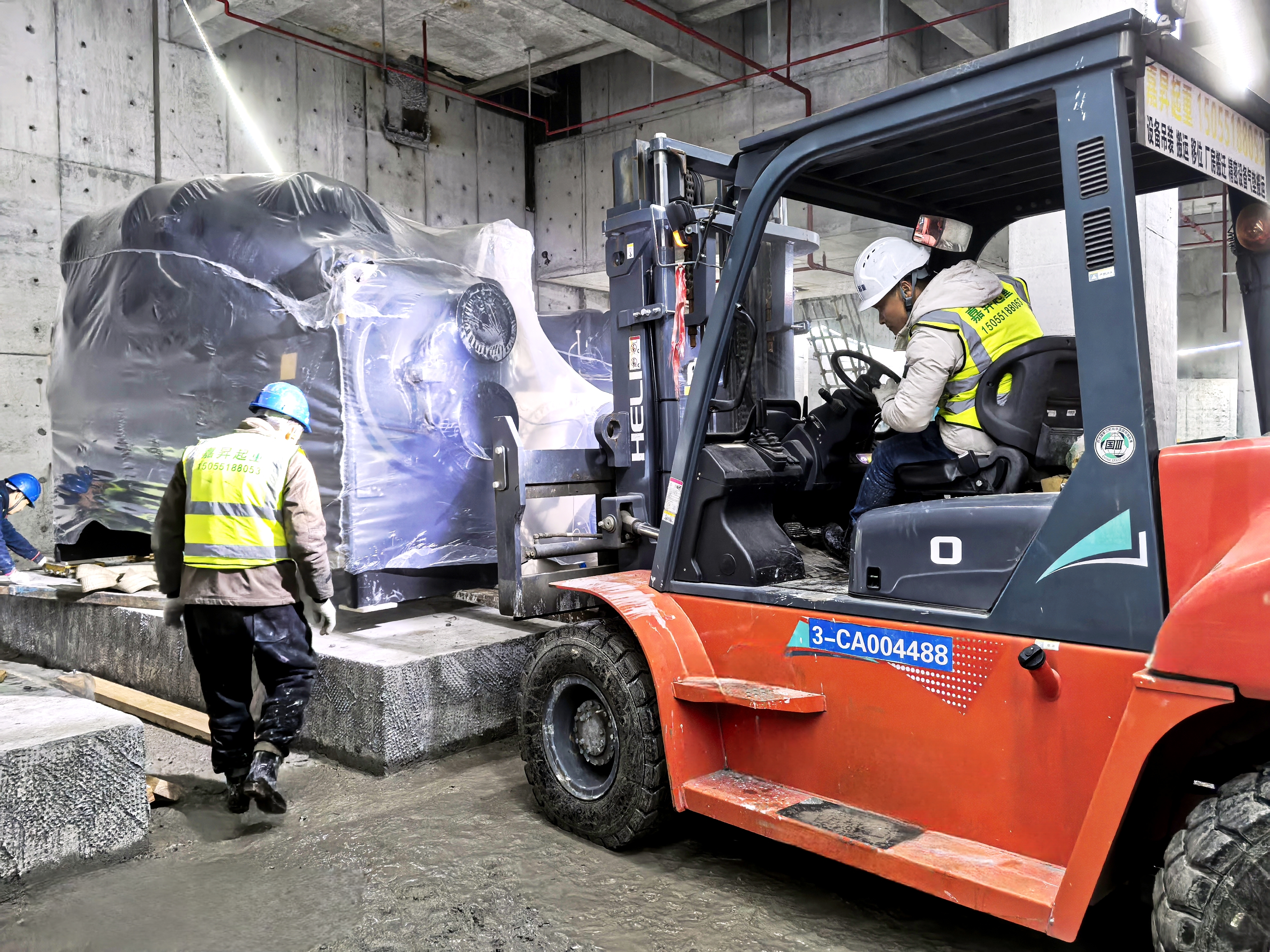 清晨7時(shí)許,施工現(xiàn)場已是一片繁忙而有序的景象。醒目的安全警戒線早已拉設(shè)完畢,擴(kuò)音器中不斷傳來清晰而有力的安全提示語,為整個(gè)施工現(xiàn)場營造出濃厚的安全生產(chǎn)氛圍。隨著1臺(tái)130噸級重型吊車和數(shù)臺(tái)重型叉車的準(zhǔn)時(shí)進(jìn)場,吊裝作業(yè)正式拉開了帷幕。在管理人員的精準(zhǔn)引導(dǎo)下,吊車巨大的起重臂緩緩升起,宛如一條鋼鐵巨龍般騰空而上,將一套套冷卻設(shè)備從吊裝口穩(wěn)穩(wěn)“銜”起,再精準(zhǔn)無誤地落到指定位置。機(jī)房內(nèi),兩臺(tái)叉車在工作人員的協(xié)同配合下靈活穿梭,將設(shè)備準(zhǔn)確安置到預(yù)定的安裝位置。整個(gè)吊裝過程井然有序,緊張而不失從容。夜幕降臨,寒風(fēng)刺骨,但現(xiàn)場依然是一片熱火朝天的大干景象,大伙兒似乎都已經(jīng)忘卻了疲憊和寒冷。終于,經(jīng)過全體人員近12個(gè)小時(shí)的不懈奮戰(zhàn)和連續(xù)作業(yè),所有重型設(shè)備均成功吊裝到位。隨著吊車和叉車有序撤離施工現(xiàn)場,本次吊裝作業(yè)圓滿完成。